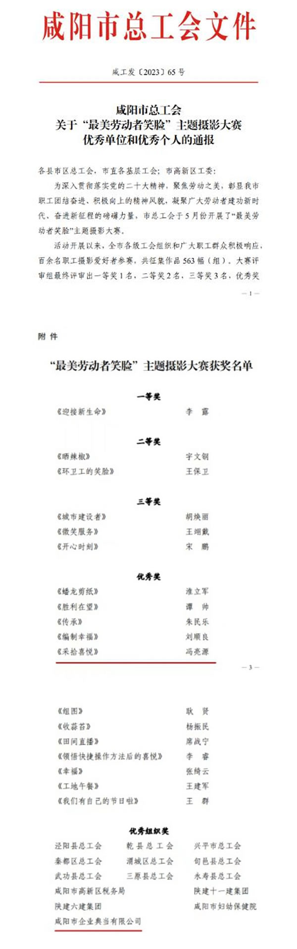 12月12日,由咸陽市總工會舉辦的“最美勞動者笑臉”主題攝影大賽公布比賽結(jié)果,我公司職工馮亮源攝影作品《采拾喜悅》榮獲“優(yōu)秀獎”;公司獲頒“優(yōu)秀組織獎”。