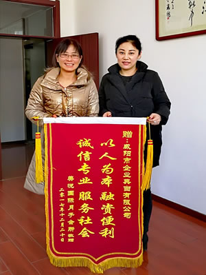2017年12月20日下午,天氣晴朗,陽光明媚,咸陽美悅國際月子會所負(fù)責(zé)人來到咸陽市企業(yè)典當(dāng)有限公司,贈送印有“以人為本、融資便利、誠信專業(yè)、服務(wù)社會”的錦旗,以此感謝企業(yè)典當(dāng)公司給予的大力支持和幫助。