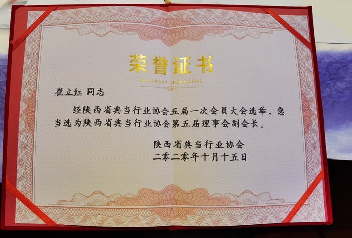 10月15日,陜西省典當(dāng)行業(yè)協(xié)會五屆一次會議在西安人民大廈隆重召開,大會選舉產(chǎn)生了省典協(xié)新一屆會長單位、副會長單位,并舉行授牌儀式。咸陽市企業(yè)典當(dāng)有限公司成功當(dāng)選省典協(xié)理事會副會長單位,公司董事長崔立紅同志當(dāng)選為副會長。